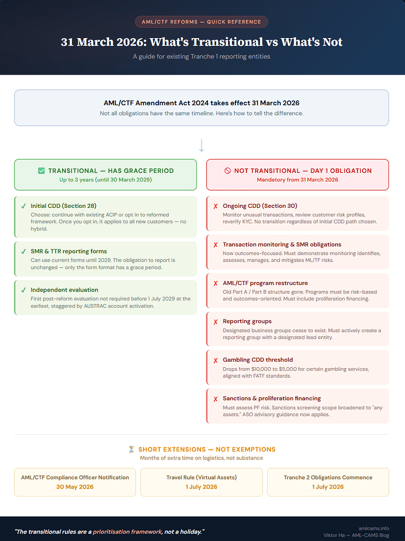 This is where the industry conversation has a blind spot. The following obligations under the reformed AML/CTF regime commence on 31 March 2026 with no transition period, no grace period, and no phased implementation.